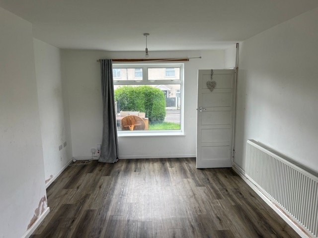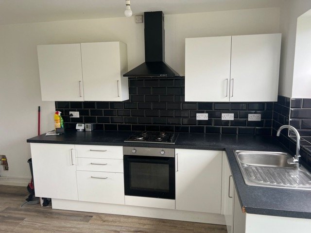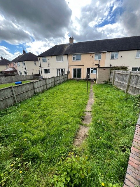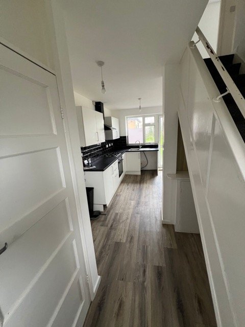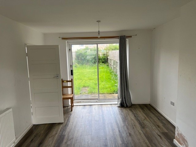Three-bedroom terraced house for rent, featuring a modern kitchen, bathroom, front and back garden.
